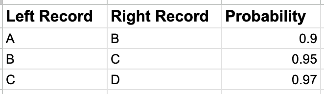 This list of probabilities alone is not of much help by itself. What we need next is an algorithm that can link together all records that are connected to each other through a chain of high probabilites into a single person identity and assign all those records a common person_id. For example, the table above tells us that: